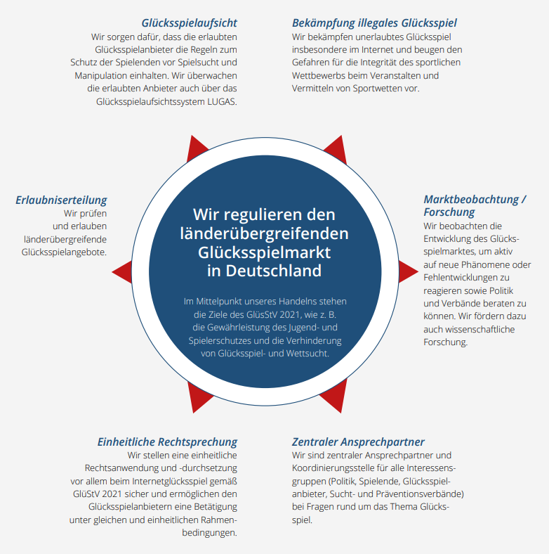 Die GGL reguliert den länderübergreifenden Glücksspielmarkt in Deutschland. Sie ist die Erlaubnis und Aufsichtsbehörde für länderübergreifende Glücksspielangebote insbesondere im Internet.